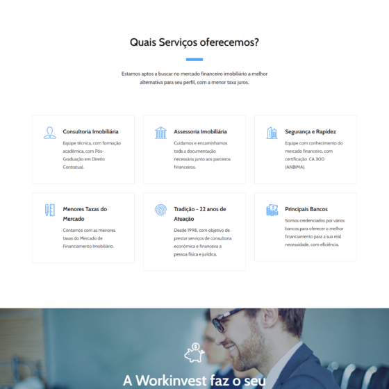 Criação e desenvolvimento do Website, do Sistema e das Redes Sociais para o cliente Workinvest. Com toda a manutenção mensal do site, da respectiva hospedagem, e com gerenciamento de todas as Redes Sociais.